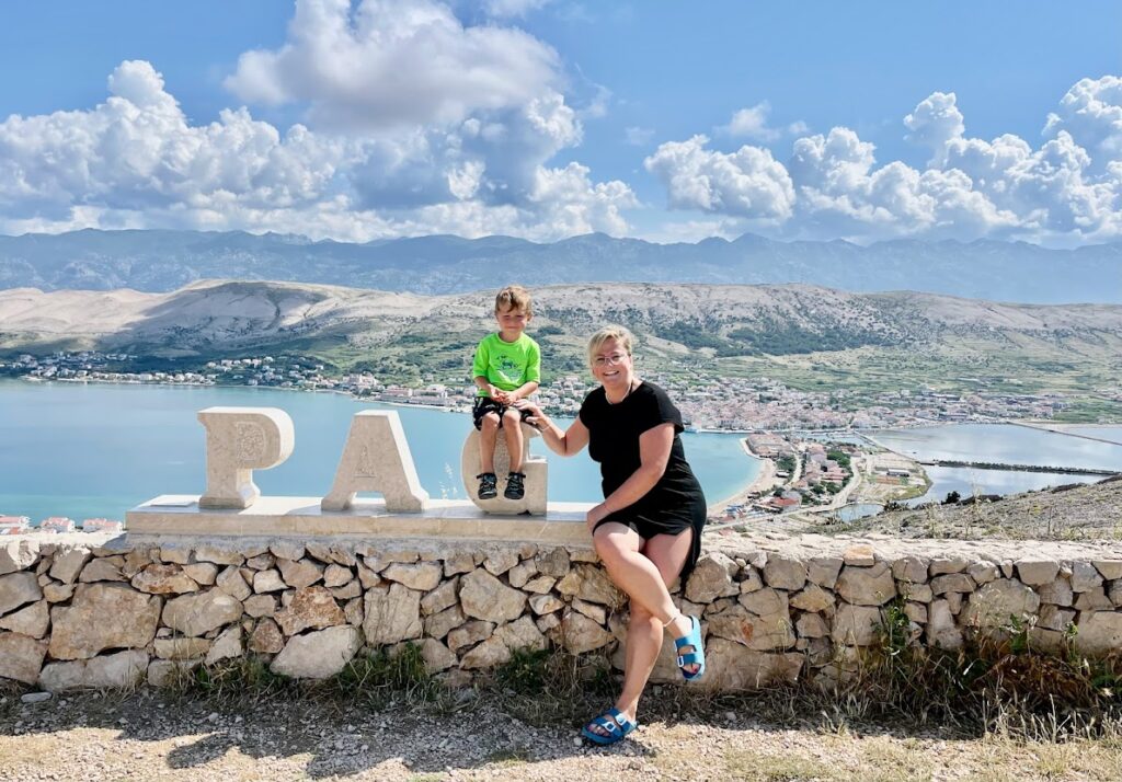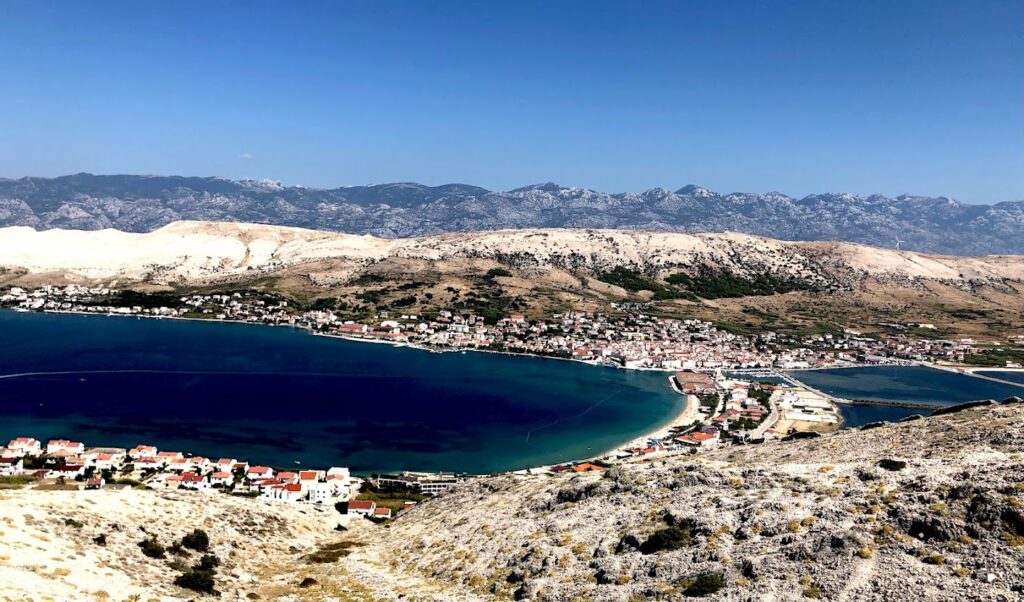 Z Pagu, cestou do Novalji či na Čistou Plažu, jistě neminete vyhlídku na město Pag. Nápis vytesaný z kamene se tam nachází teprve od května 2023 a výhledy jsou odsud famózní.